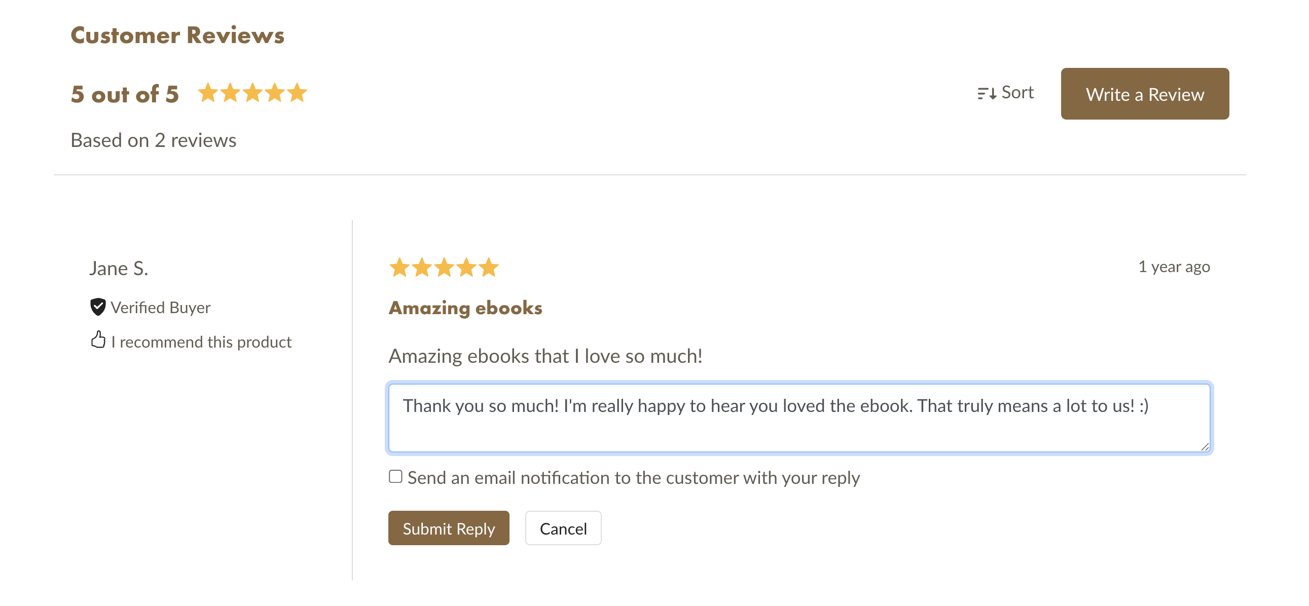 Option 2: Go to the product page that received the review and scroll down to the reviews section. Find the review you want to respond to, click the Reply button, type your response, then click Submit Reply.