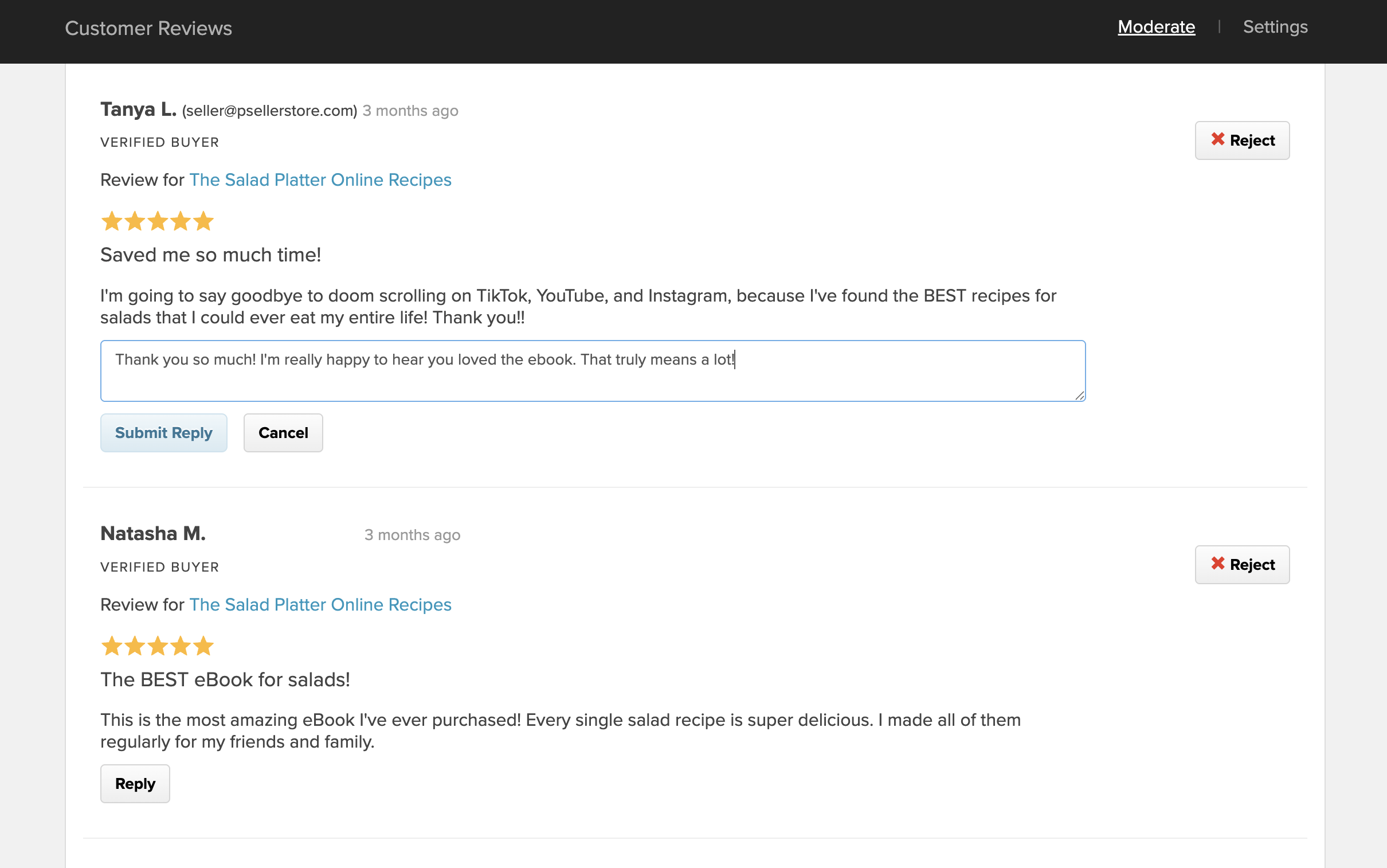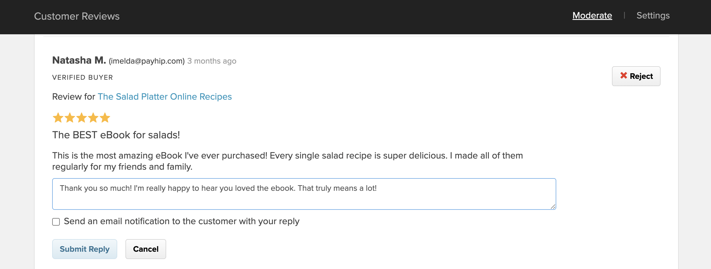 Option 1: From your Payhip dashboard, go to Products → Reviews → Moderate. Find the review you want to respond to, click the Reply button, type your response, then click Submit Reply.