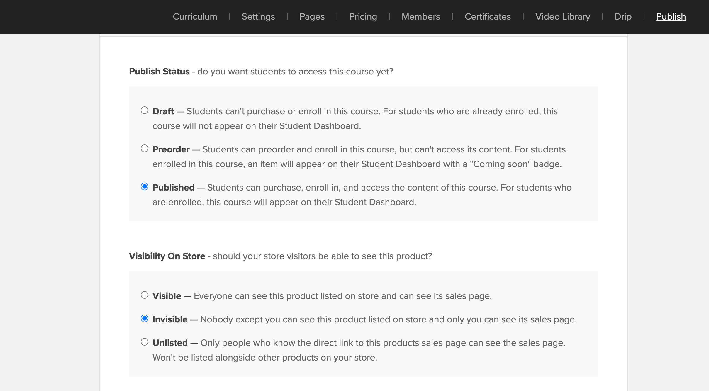 When editing a course product, there's a Publish tab where you'd be able to change the Publish status and Visibility on Store.