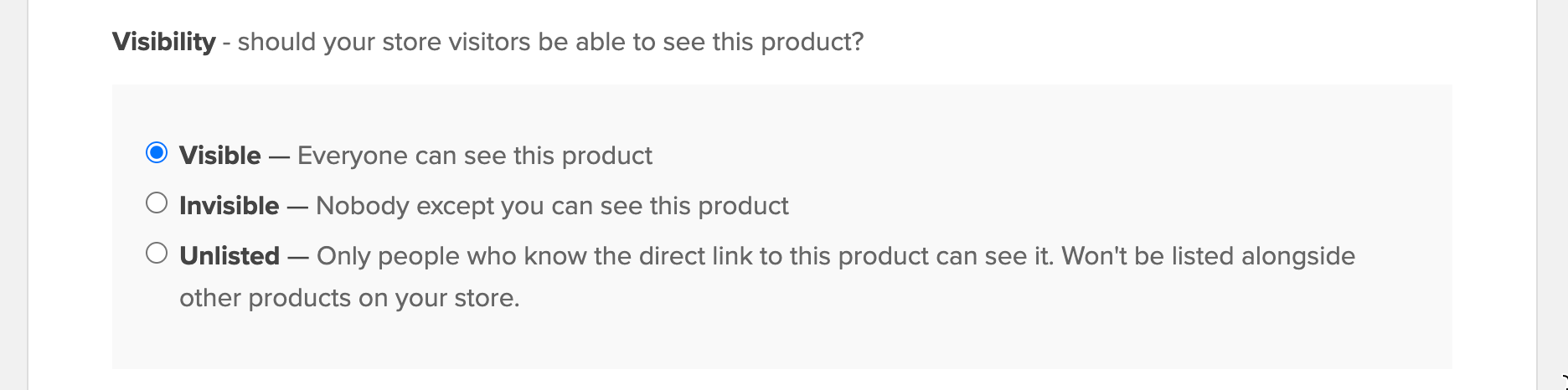 When setting up your store, you can control how your products appear to customers through product visibility settings. This determines whether products can be found on your storefront, through direct links, or hidden entirely.