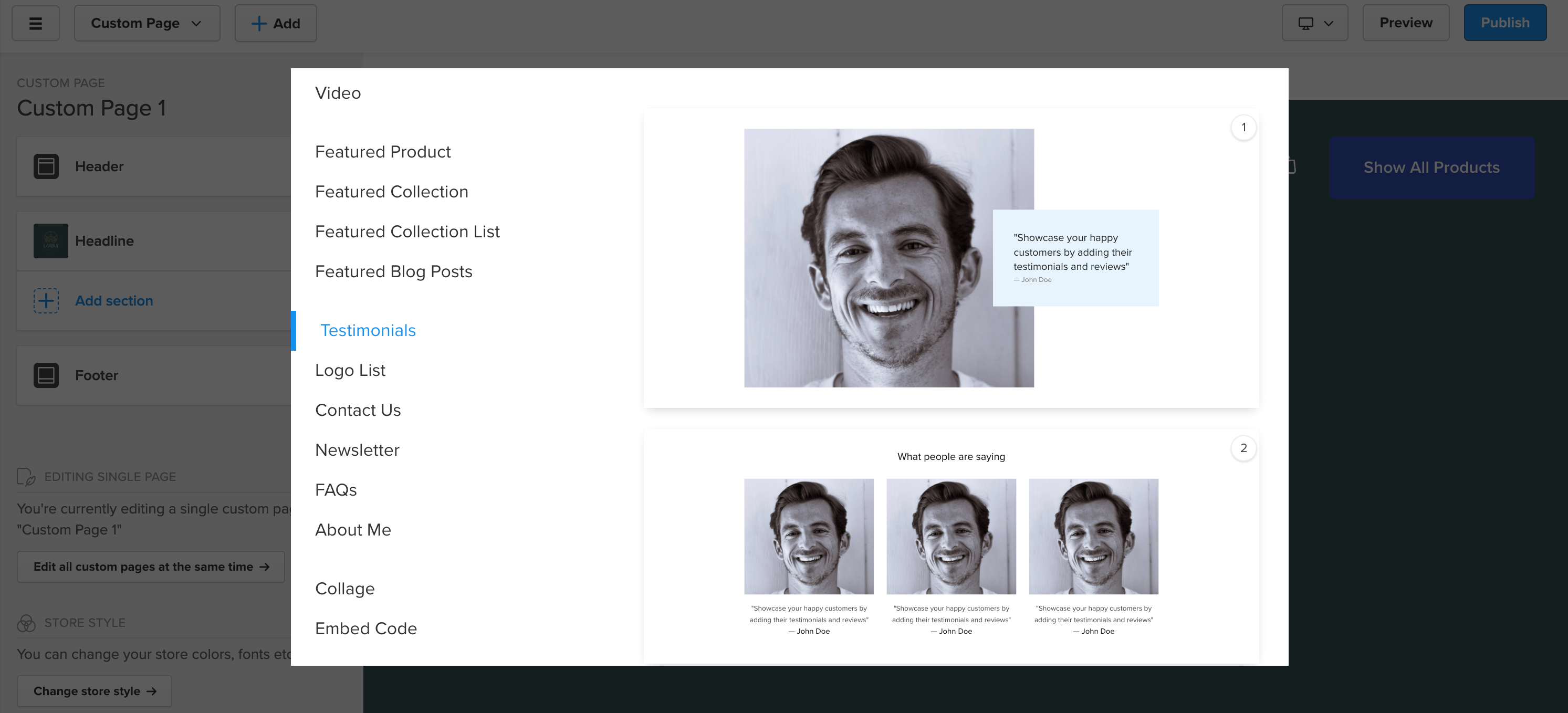 The Testimonials section is a feature of Store Builder that allows you to display customer feedback directly on your store pages. It helps you build trust with new visitors by showcasing real experiences and reviews from people who have purchased your products or used your services.