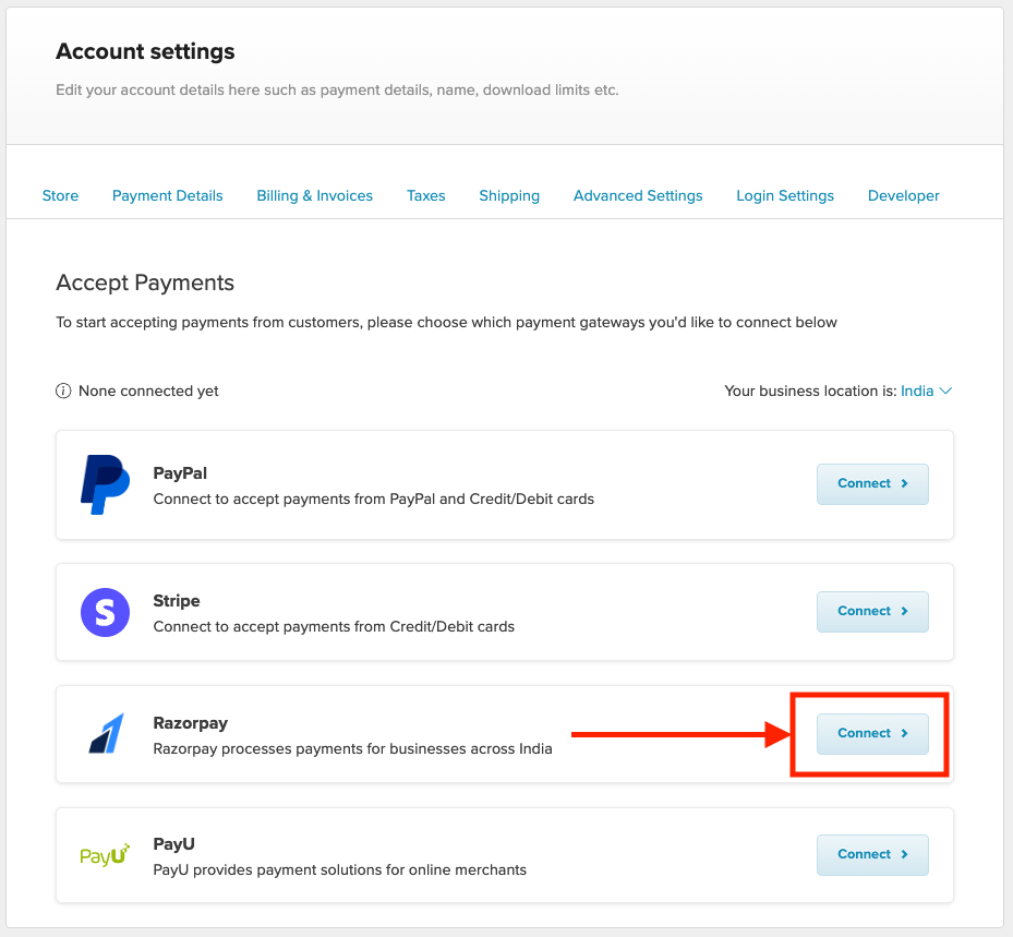 In your Payhip dashboard, go to Account → Settings → Payment Details. You'll see a list of payment gateways available in your region, including Razorpay (if it's available to you). If you don't see the option, click See All Payment Options to see the full list of supported payment gateways.