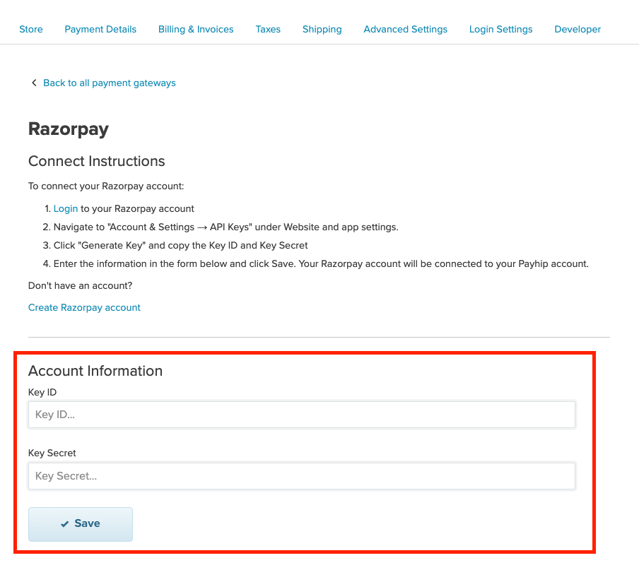 Note that the currency used in your Payhip account must match the currency in your Razorpay account.