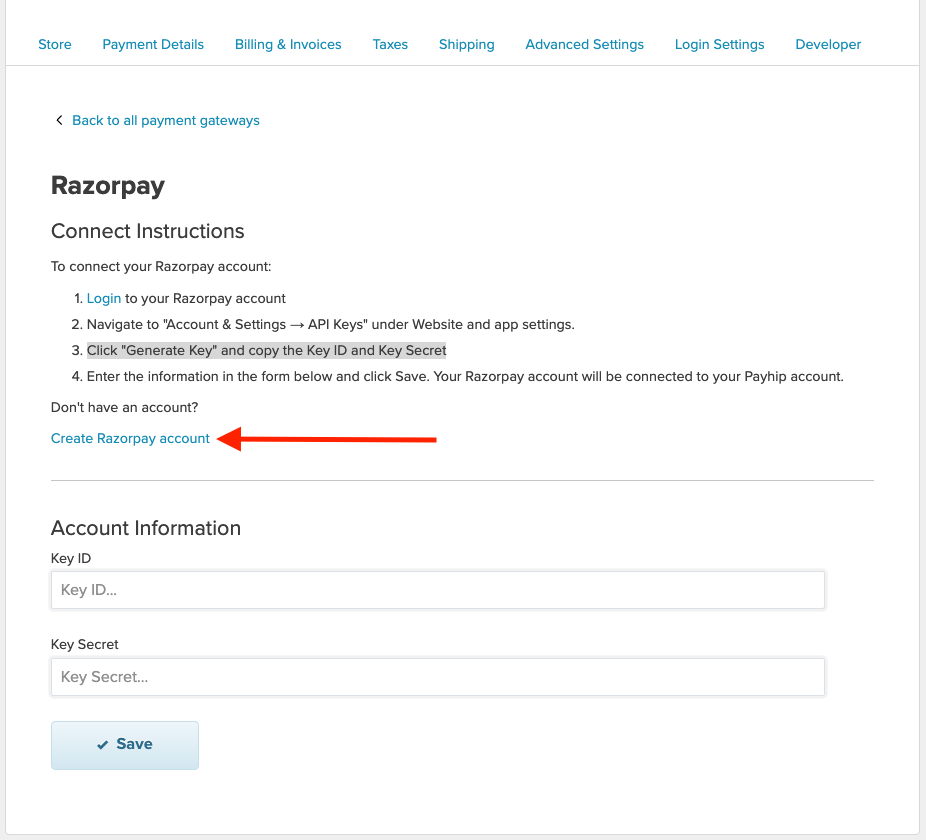 If you don't have a Razorpay account yet, there is a link to create a new Razorpay account for free on your Payhip dashboard. Simply follow the on-screen instructions to set up your new Razorpay account.