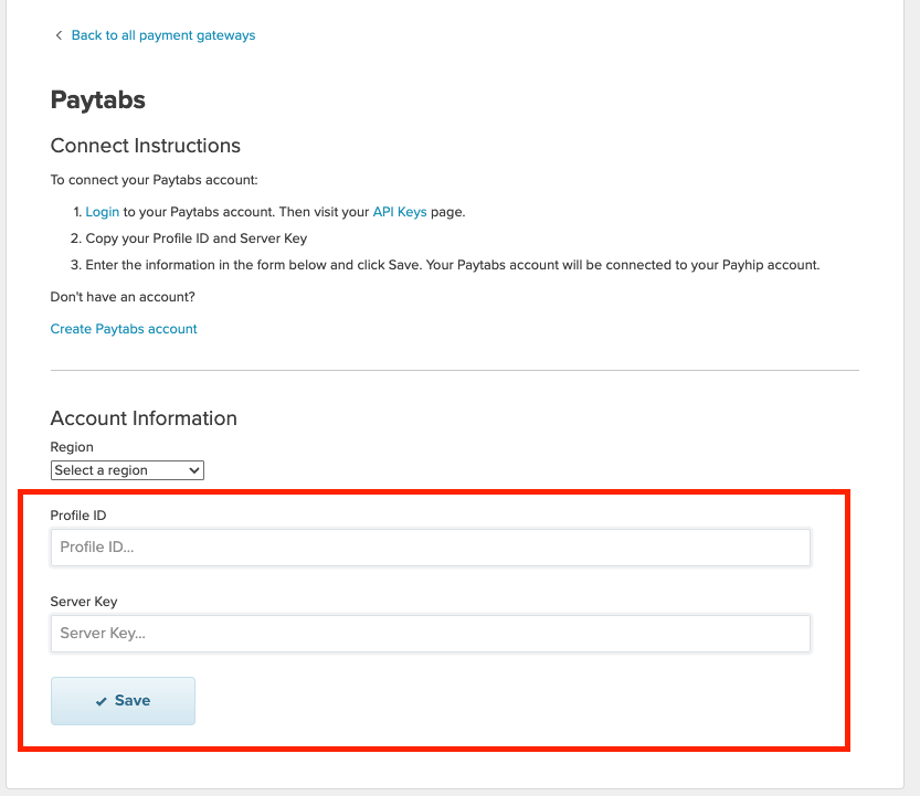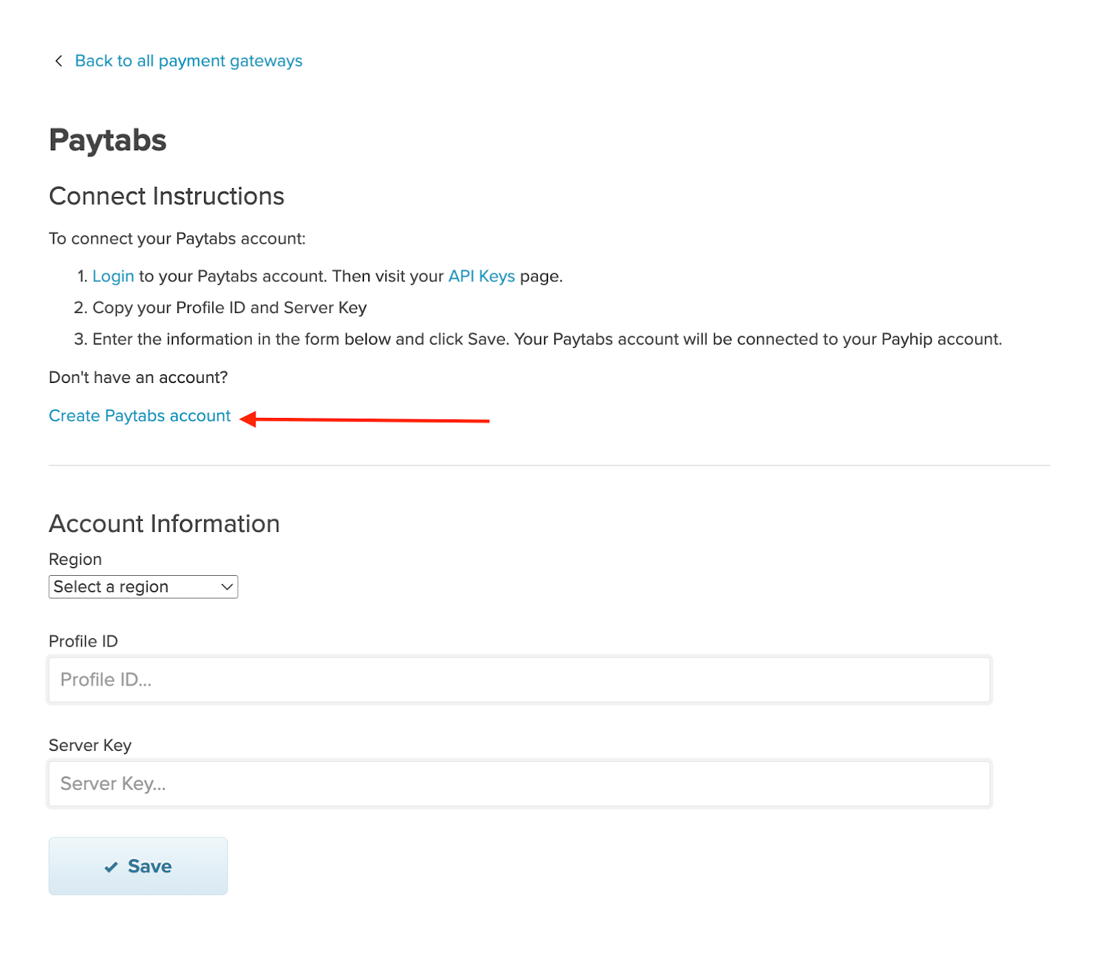 If you don't have a PayTabs account yet, there is a link to create a new PayTabs account for free on your Payhip dashboard. Simply follow the on-screen instructions to set up your new PayTabs account.