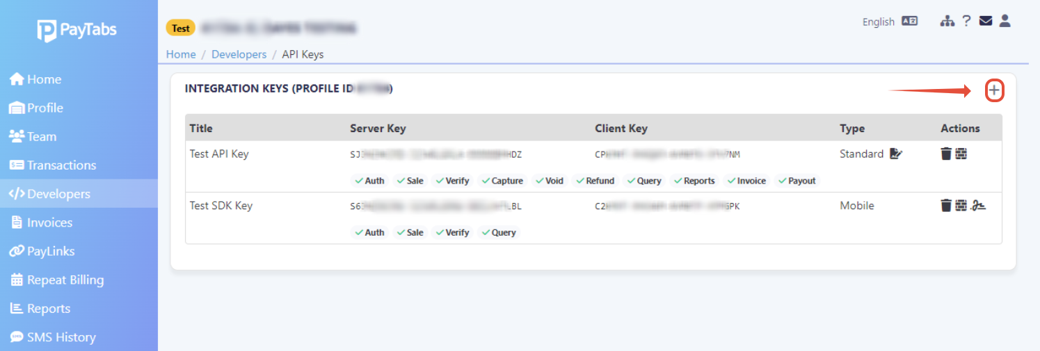3) Click the (+) icon to generate new API keys. Now you can copy the Server Key, and paste them into the corresponding fields on your Payhip dashboard.